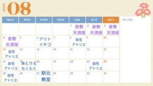 2025.08.08 お知らせ 8月の教室スケジュール 毎日暑いですねえ。 8月の教室スケジュールです。 9月の教室作品展に向けてみなさん頑張っておられます。 もちろん 初めてのかたも大歓迎です。お気軽にお問い合わせください。 SHAREシェアする [addtoany]
